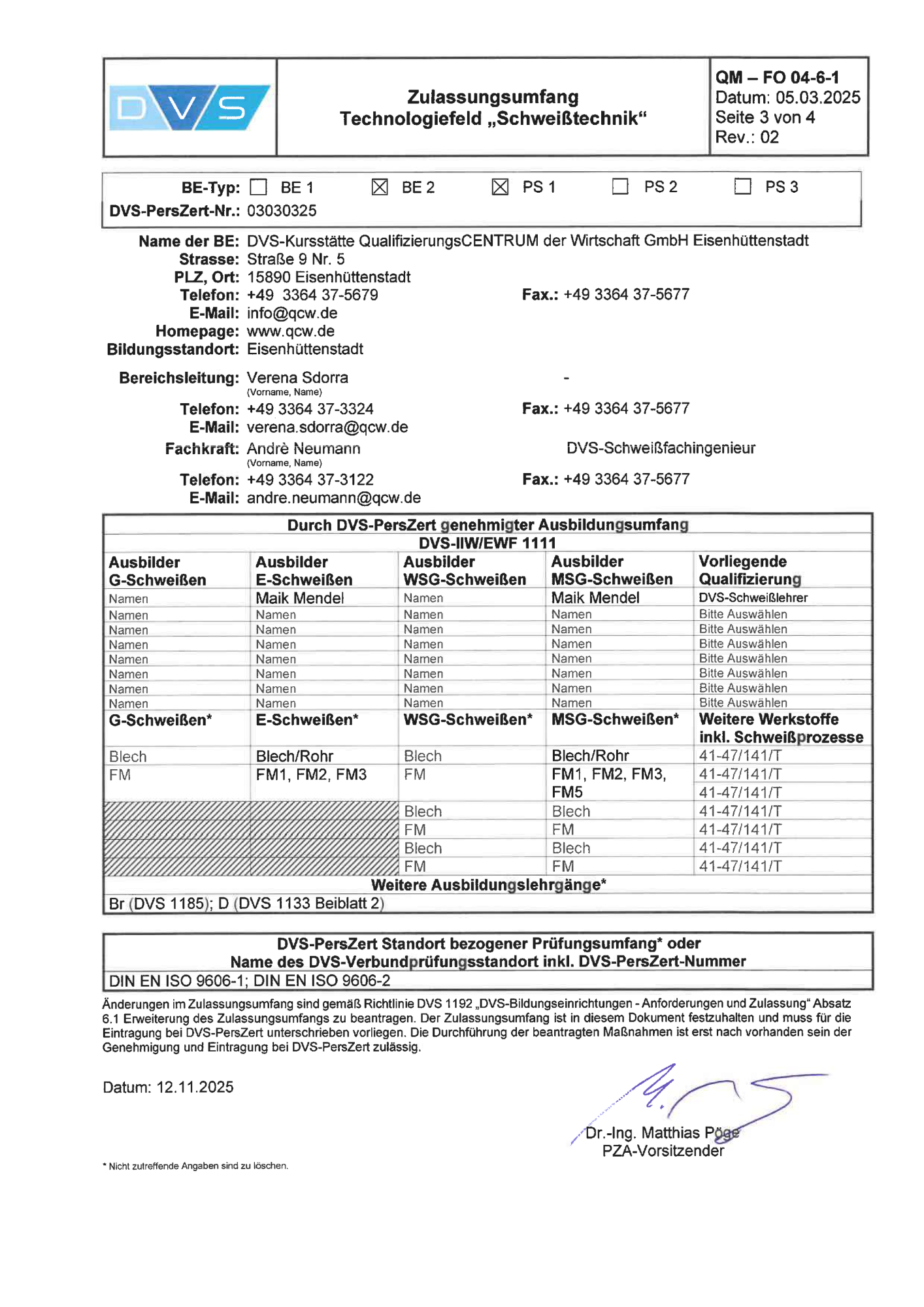Die QCW GmbH verfügt als Schweißtechnische Kursstätte des DVS über eine langjährige Erfahrung in der Ausbildung von Schweißfachkräften, die auf nationalen und internationalen Normen und Regeln basiert. Unsere qualifizierten Ausbilder unterliegen den Zertifizierungsbedingungen des DVS. Die modern eingerichtete Schweißerwerkstatt verfügt über insgesamt 16 Schweißarbeitsplätze.